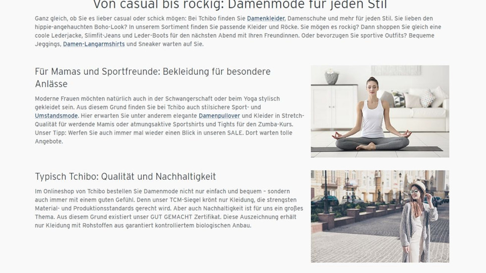 Interne Verlinkung zu Blogartikeln, Größentabellen, Versandkosten und einzelnen Produkten oder Kategorien. Du kannst gerade die Texte am Ende der Segmentseiten dafür nutzen und somit einen organischen Flow auf der Seite generieren, die von Google positiv bewertet wird.